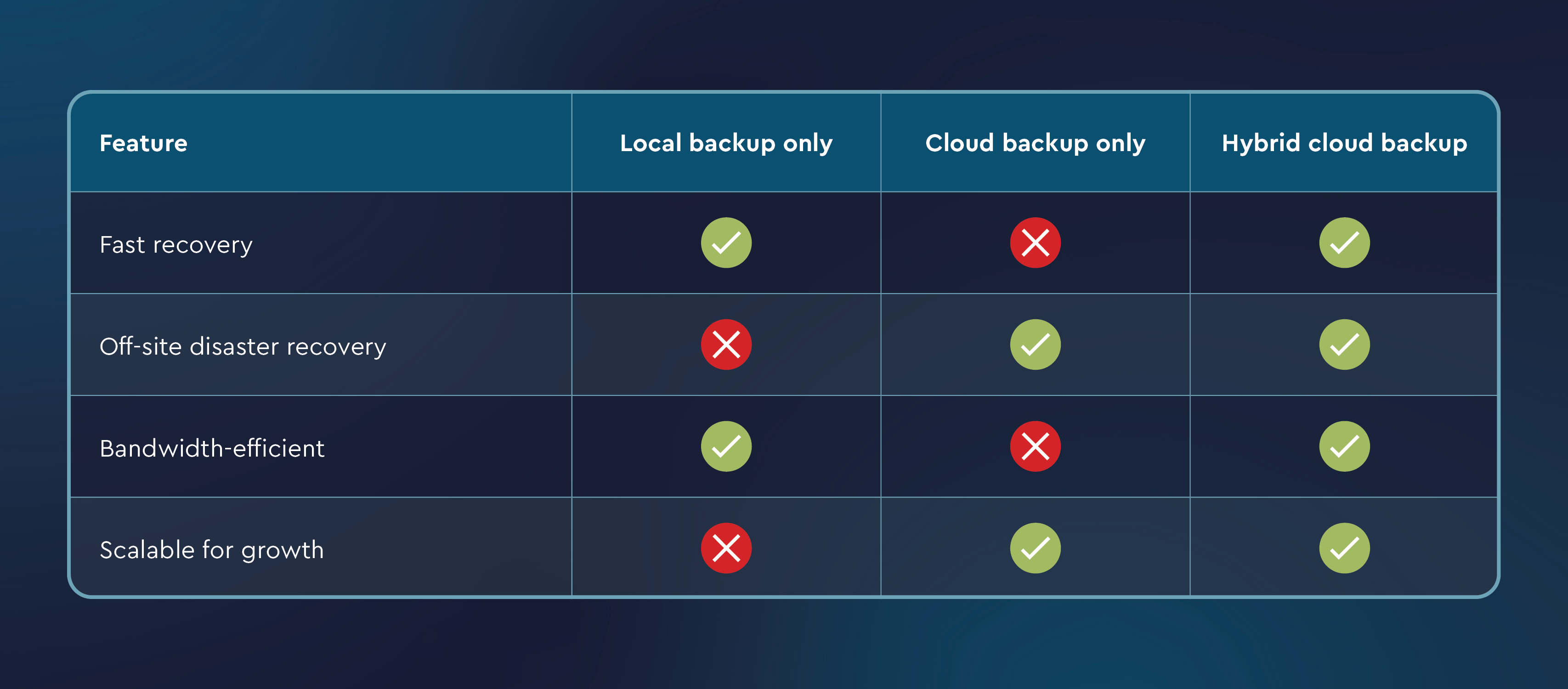 Hybrid cloud backup bridges the gap left by single-solution backup.